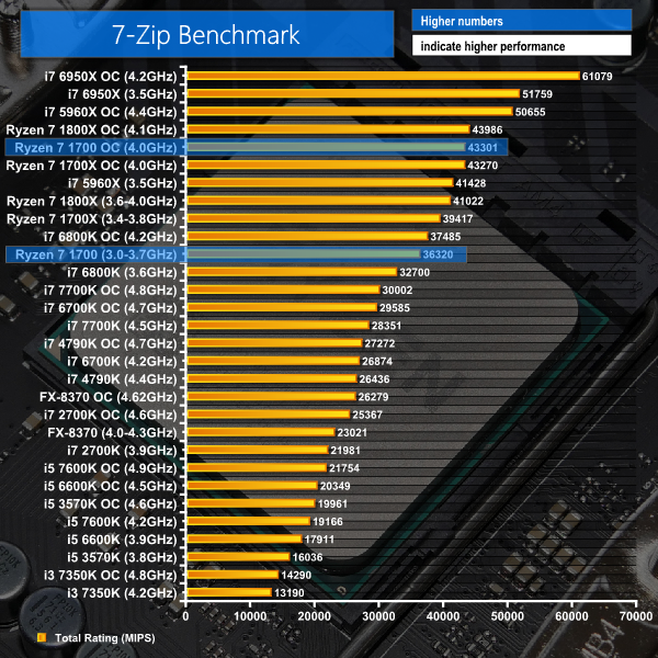 7-Zip likes cores and memory bandwidth so Ryzen 7 1700 paired with fast DDR4 takes a comfortable position behind the Intel HEDT 8+ core chips. Even with the 7700K overclocked to 4.8GHz, stock-clocked Ryzen 7 1700 enjoys a 21% performance lead that extends to 43% with the AMD chip at 4.0GHz.