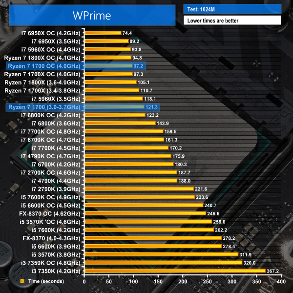 WPrime takes advantage of the 1700's sixteen threads for number crunching and returns stellar performance. The £330 chip comfortably holds its own against Intel's £1000 octa-core and the similarly-priced 4C8T 7700K is noticeably slower than Ryzen 7 1700, even with a 1GHz+ frequency advantage.