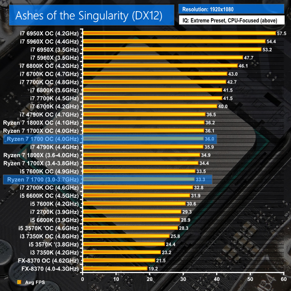 For high refresh-rate gaming with DX12 titles, the Core i7-7700K is a better choice than Ryzen 7 1700 at £330. Of course, developers may better utilise the additional threads of Ryzen 7 in the future, and there is also a higher proportion of the CPU horsepower in reserve for multi-tasking whilst also gaming (compared to the 7700K). As it stands, though, Kaby Lake's i7-7700K is faster for gaming and that's visible at more than 60 FPS.