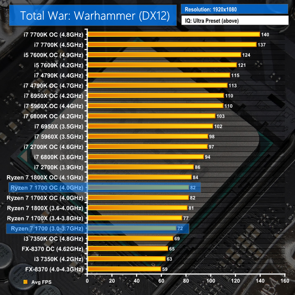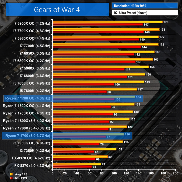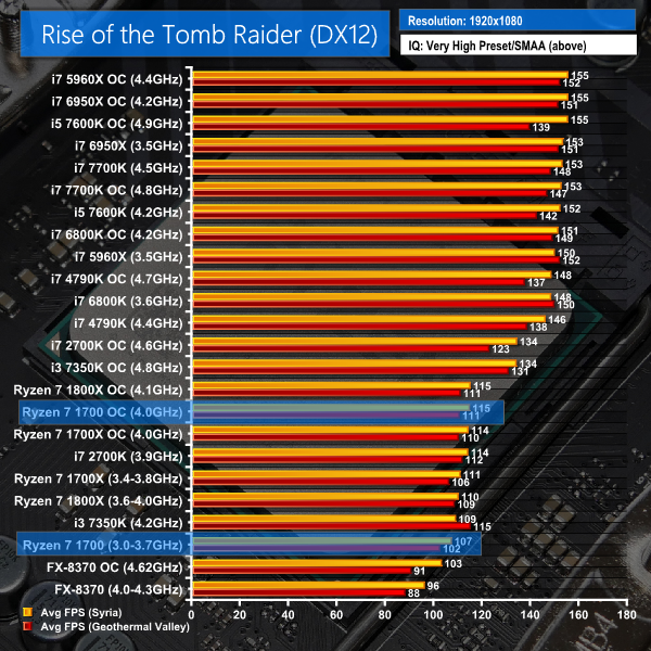 The same is still true, though; if you game at 60Hz, Ryzen 7 1700 performance will be similar to Intel's Kaby Lake Core i5 and Core i7 offerings, as well as other high-end Intel processors. However, switching focus to high refresh-rate gaming, Ryzen 7 1700 shows weaknesses when targetting 120+ FPS in Rise of The Tomb Raider and Gears of War 4, and cannot manage 100 FPS in Total War: Warhammer, even when overclocked.
