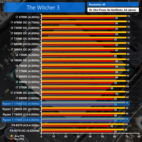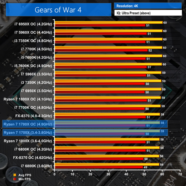 Throw Ryzen 7 1700X into a GPU-limited situation where performance above 60 FPS is superficial and it handles itself well. You are unlikely to notice a difference between the 1700X and higher-priced (and lower, for that matter) Intel CPUs except for that fact that Ryzen 7 has significant spare processing power to conduct background operations, such as game streaming.