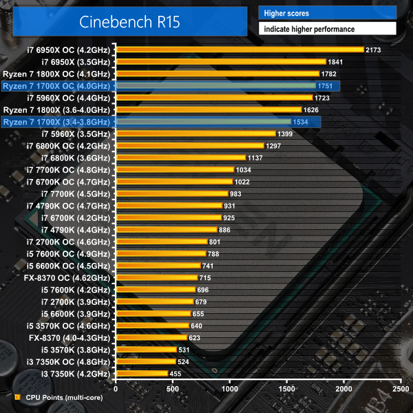 Its balance of cores, threads, and clock speed put the Ryzen 7 1700X in good positions in these three benchmarks. Cinebench multi-threaded performance puts the stock-clocked 1700X ahead of a Core i7-5960X that cost two-and-a-half times as much when it dominated the market just a couple of years ago. Overclocking the 1700X to 4GHz brings it to within 90 points (5%) of the stock Core i7-6950X which cost more than four times as much.