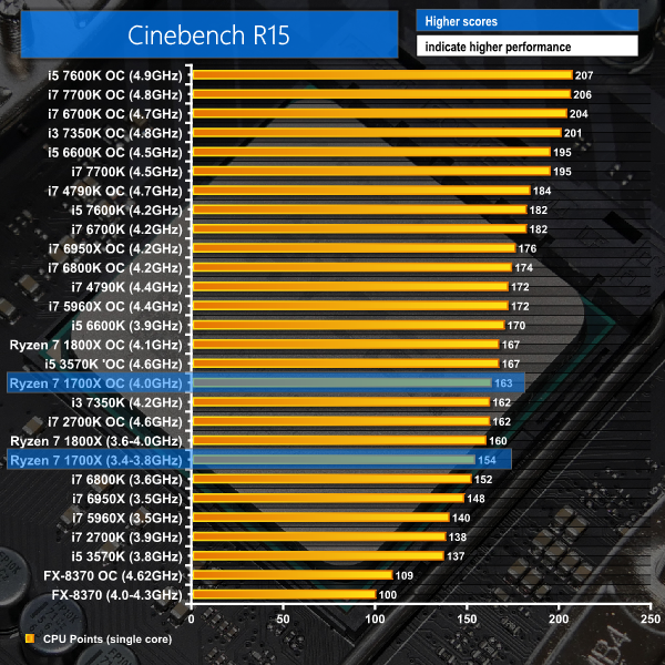 Single-core performance is good and sits somewhere between Haswell-E and Broadwell-E levels. Cinebench sits the Ryzen 7 1700X just above a stock-clocked 6800K in Cinebench's single-core test, although the 1700X is benefiting from enhanced operating frequencies thanks to its 3.8GHz Precision Boost capability and up to 3.9GHz clock speed with XFR.