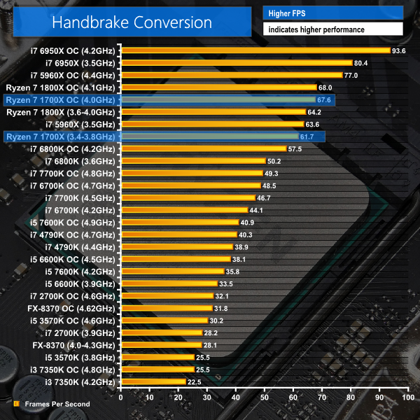 Handbrake shows solid performance thanks to its ability to saturate the Ryzen 7 1700X's 16 threads while also taking advantage of its clock speed. You get performance close to Intel's 8C16T Haswell-E chip under stock-clocked conditions. Add in an overclock to the 1700X and you can beat Intel's 8C16T contender. However, Handbrake makes good use of the Intel HEDT chips' fat AVX pipelines and quad-channel memory, allowing the 5960X (when overclocked) and 6950X to dominate at the top of the chart. Still, Ryzen 7 1700X looks to be a superb value option if you have a large media library ready for converting and offloading onto a network media server or portable device.