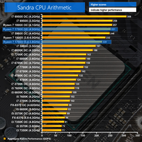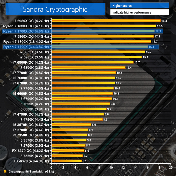 SiSoft Sandra's tests show the Ryzen 7 1700X to be a computationally strong processor. Cryptographic performance is good, which is perhaps thanks to the pair of baked-in AES units.