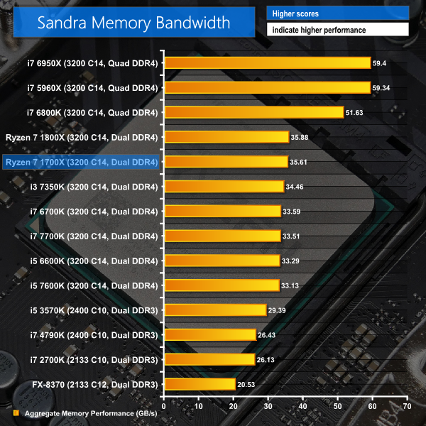 Memory bandwidth can be considered a downfall for the AM4 platform and Ryzen 7. While more than 35GBps of memory bandwidth with high-speed modules is not an insignificant amount, it pales in comparison to the comfortable 50GBps+ offered by Intel's quad-channel equipped HEDT CPUs. If you have a scientific computing or similar workload that benefits from memory bandwidth, dropping a pair of cores to opt for Intel's similarly-priced Core i7-6800K may be a smarter option than the Ryzen 7 1700X.