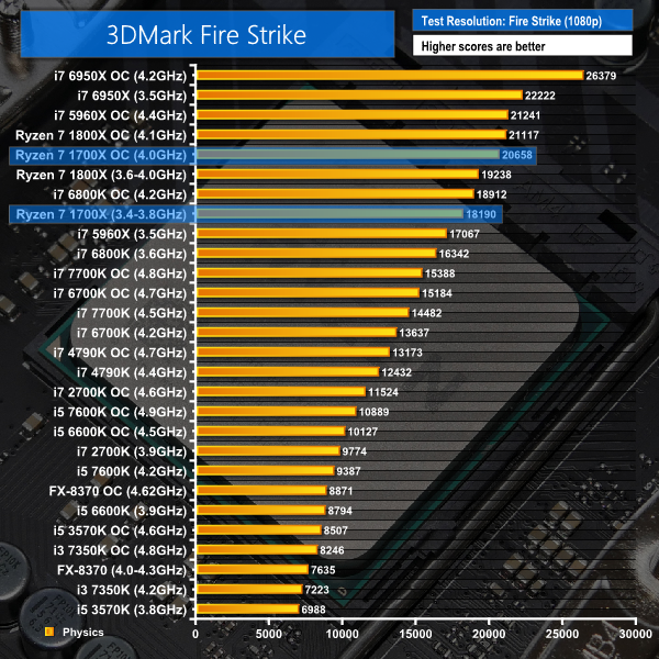 Scores in FutureMark's 3DMark tests are strong, though the hierarchy does shift somewhat compared to computational performance thanks to the i7-5960X's ability to take easier victories at stock and overclocked frequencies. Pure DX12 performance, as indicated by the Time Spy CPU test, looks to have strong potential for the Ryzen 7 1700X. That's a point that may be worth noting to consumers purchasing a multi-purpose CPU to last a number of years, during which time DX12 will be more prevalent.