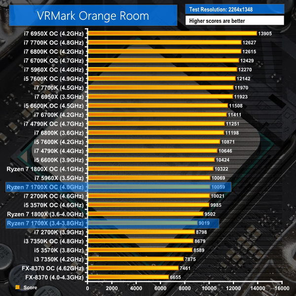 The recently-released VRMark benchmark aims to score systems based on their VR performance potential by using rendering resolutions associated with VR devices of today and the future. We test using the Orange Room benchmark which uses a rendering resolution of 2264×1348 to analyse the capability of hardware with current devices such as the HTC Vive and Oculus Rift.