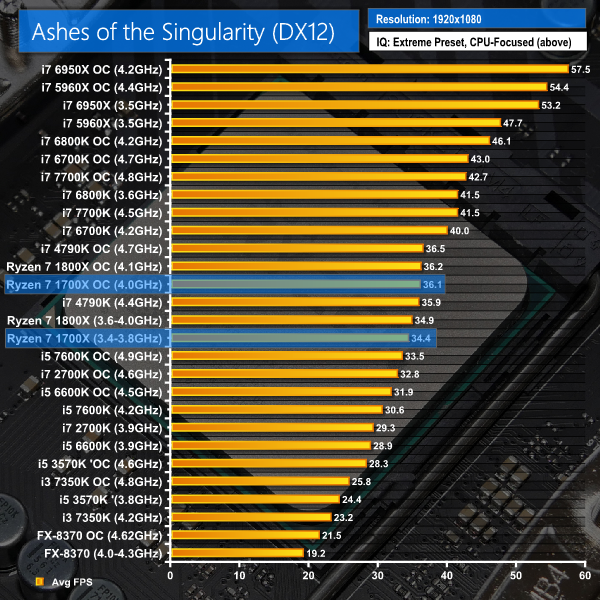 Ashes of the Singularity puts the Ryzen 7 1700X around Haswell Core i7-4790K performance numbers. The 6C12T Broadwell-E 6800K is noticeably faster both at stock frequency and when overclocked.
