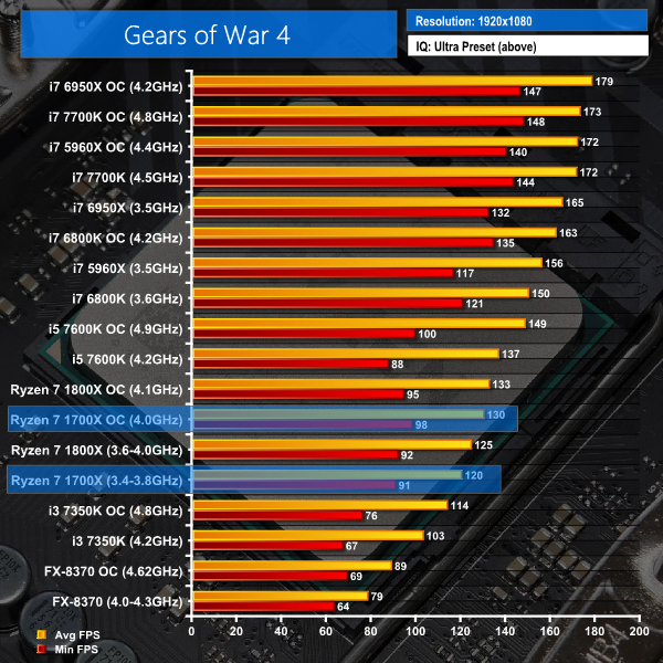 Gears of War 4 puts Intel's modern 4+ core chips ahead of the Ryzen 7 1700X. Looking at the actual numbers, though, the 1700X was able to deliver an average frame rate of 120 FPS at stock and 130 FPS when overclocked. Minimum FPS numbers were 91 and 98 at stock and overclocked speeds, respectively. Even to high refresh rate gamers, losses for Ryzen 7 in Gears of War 4 are hardly deal-breakers with the AMD chip putting out such functional real-world performance numbers. With that said, if you are a gamer who simply demands that your system has performance to lock your 120Hz monitor at its maximum refresh rate, Ryzen 7 will not do that.