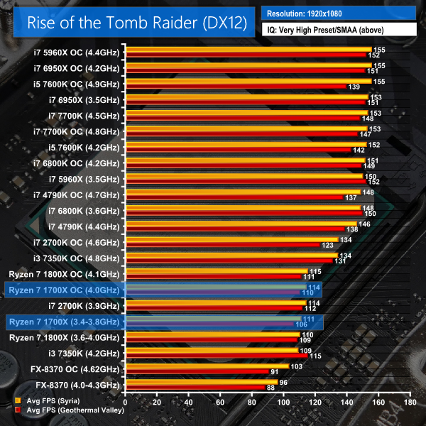 Rise of the Tomb Raider in its DX12 mode is also slower on Ryzen 7 1700X than on many of the modern Core i5 and Core i7 CPUs that we compared it against. With that said, we are talking about average frame rates over 100 FPS for the 1700X, so this performance deficit is likely to be immaterial if you game at 60Hz or even 100Hz.