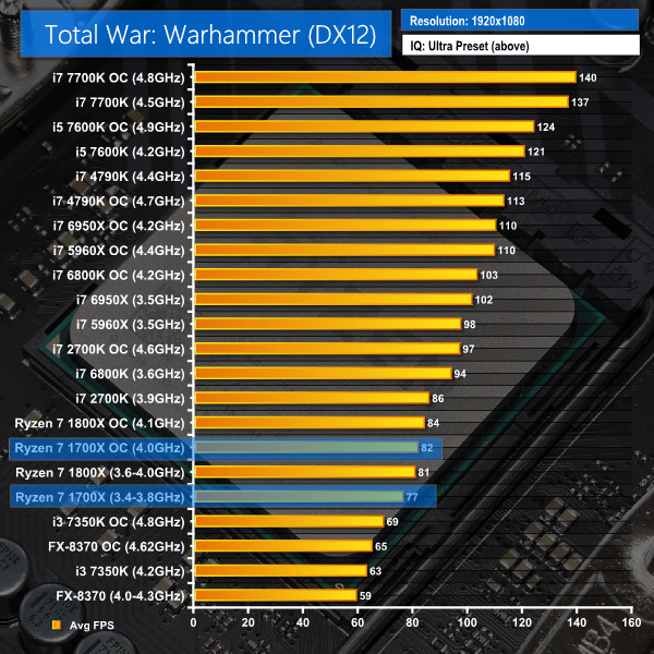 Clock speed and IPC are critical to Total War: Warhammer performance due to its preference for forcing data through a single thread. Even accounting for those limitations, the 1700X's performance is noticeably lower than that of a 6C12T i7-6800K. You don't need 100+ FPS in this game but if you want to run it at such levels, Ryzen 7 1700X is not a smart choice with settings turned up to Ultra.