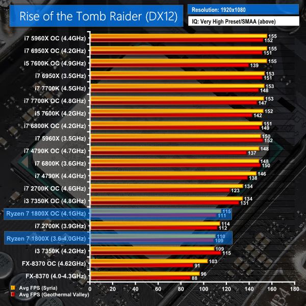 Ryzen 7 1800X is around Sandy Bridge i7 2700K performance in ROTTR DX12. The modern i5s and i7s based on Haswell architecture and newer are around 30% (or more) faster than Ryzen 7 on average. This is another disappointment, especially given that ROTTR is a DX12 title that should be able to leverage the high core count of Ryzen 7.