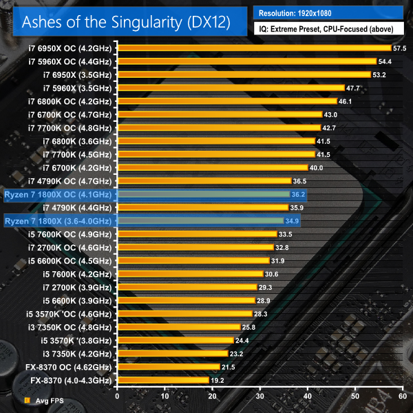 This result is surprising. Ashes of the Singularity is a very well multi-threaded benchmark, as indicated by the Haswell-E and Broadwell-E performance figures for Intel. All of Ryzen 7's threads were pinned to around 80% load when overclocked, which is a similar value to the 5960X at 4.4GHz.