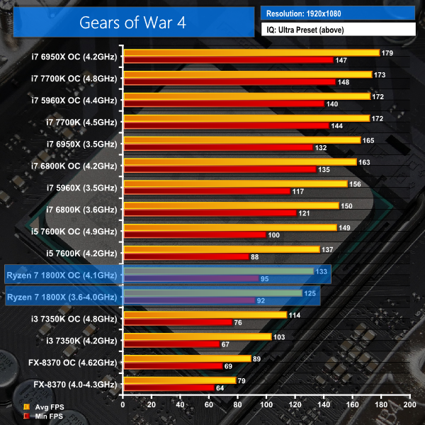 Gears of War 4 and its DX12 operating mode place Ryzen 7 1800X performance within around 10-15% of Kaby Lake Core i5-7600K. The 1800X can push more than 120FPS average at both stock and overclocked speeds, while also keeping minimums above 90FPS.