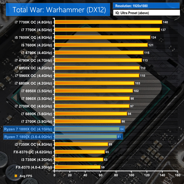 Average performance for the Ryzen 7 1800X is slightly below that of a stock-clocked Sandy Bridge 2700K. Only the old FX-8370 performs worse in this game. If you have a desire to drive Total War: Warhammer at a high frame rate, you will be better served by a fast, Skylake-based chip.