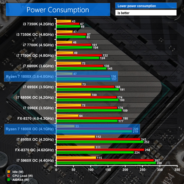 The Ryzen 7 1800X CPU's power draw numbers are fine. It won't win any efficiency medals but it isn't going to ramp up your electricity bill or the thermal energy output into your room, either.