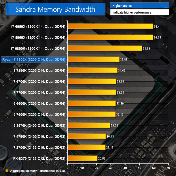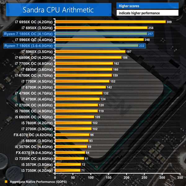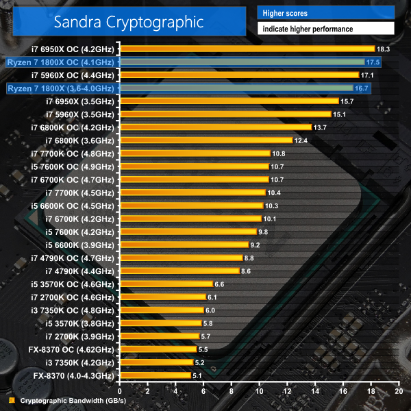 SiSoft Sandra places raw processing power of the 4.1GHz 1800X on par with a stock-clocked 6950X… at less than a third of the price. Cryptographic performance for Ryzen 7 is also strong thanks to the 1800X's ability to throw a large number of fast threads at the task. The 4.4GHz 5960X is actually beaten by overclocked Ryzen 7 1800X despite the AMD chip's 300MHz clock speed deficit.