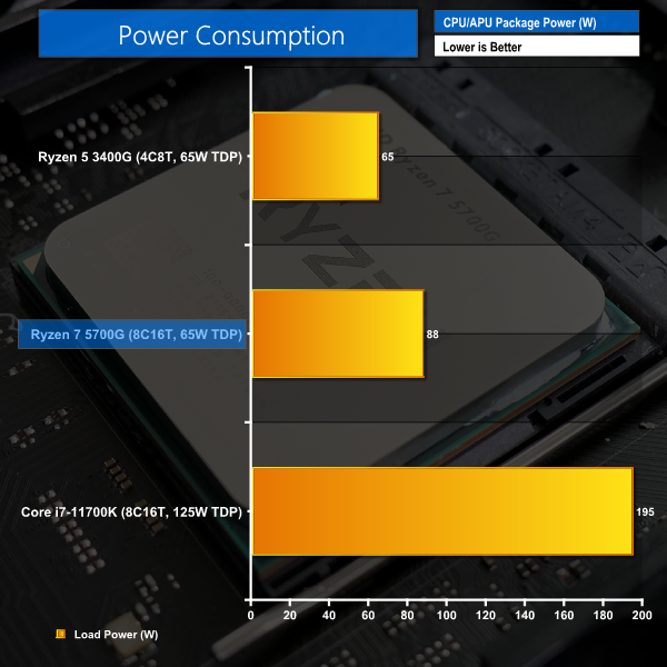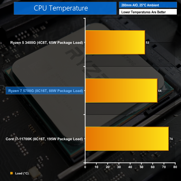 The Ryzen 7 5700G uses its full complement of 88W of package power, as dictated by the 65W TDP. This is easy to cool in a SFF installation – especially when compared to the Intel Core i7. But AMD’s APU also leaves more performance and frequency headroom to extract via PBO.
