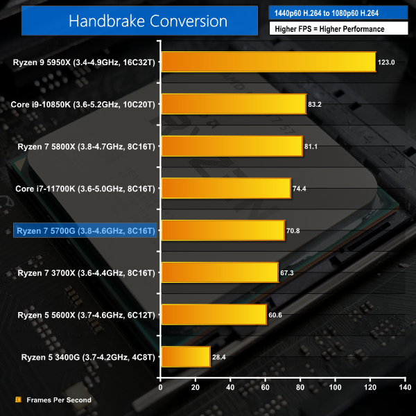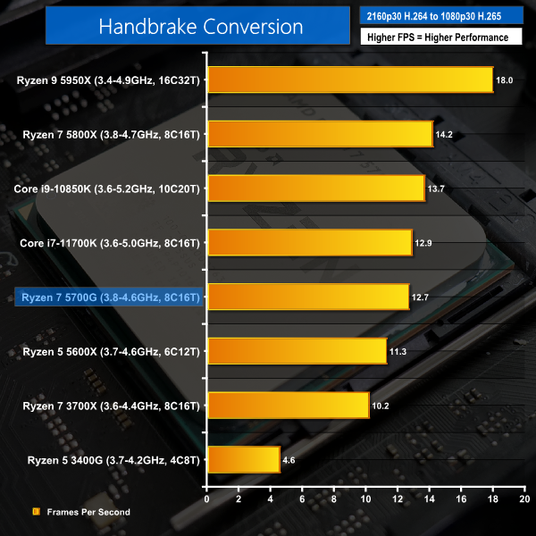 We see more of the same in the H265 Handbrake test, but this time the 5800X lead over the 5700G shrinks to 12%.