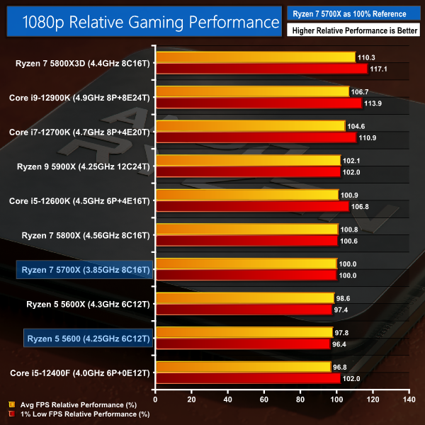 To summarise our 1080p gaming results, the Ryzen 5 5600 is marginally quicker than the Core i5-12400F for average FPS data. This outcome is skewed by a big victory for the Ryzen chip in Shadow of the Tomb Raider – a game which runs at 182 FPS on the 12400F versus 197 FPS on the 5600.