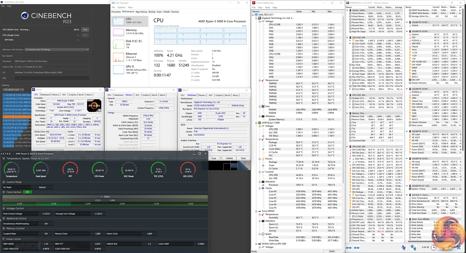 The Ryzen 5 5600 ran at around 4.25GHz all core using its full 76W of allocated package power. By comparison, the 5600X also has a 76W power allowance but managed to squeeze out around 25-50MHz higher clocks. So, there really isn’t much clock speed variance between these two, despite the pricing difference.