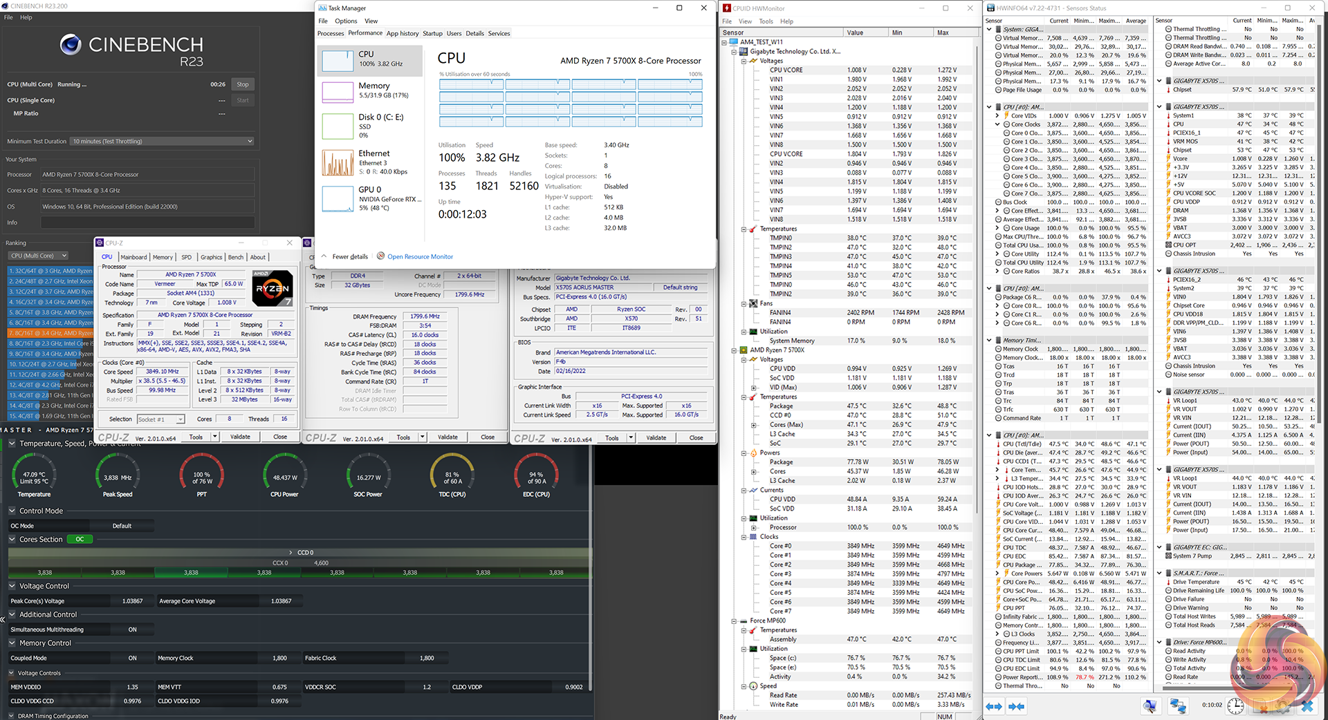 Looking at clock speeds, the Ryzen 7 5700X ran at around 3.85GHz all-core under Cinebench loading. This saw the 65W TDP chip using its full 76W package power allowance, so that was the clear restriction under the Precision Boost 2 algorithm. By comparison the 105W TDP Ryzen 7 5800X used its 142W package power allowance to run at 4.56GHz all-core – a full 0.7GHz higher!