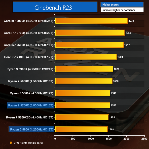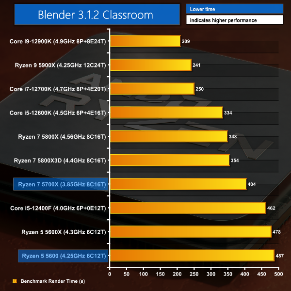 Starting out with rendering workloads, we see the Ryzen 5 5600 sitting a smidgen behind the Ryzen 5 5600X due to clock speed differences. The Ryzen 7 5700X is well behind the 105W TDP 5800X that runs around 700MHz higher clocks.