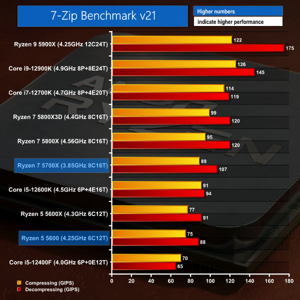 AMD’s two new chips do very well with 7-Zip workloads. The Ryzen 5 5600 beats the Core i5-12400F in compression and by a whopping 35% for decompression. While the Ryzen 7 5700X is slightly behind the 12600K for compression but is a sizable 14% quicker for decompression.