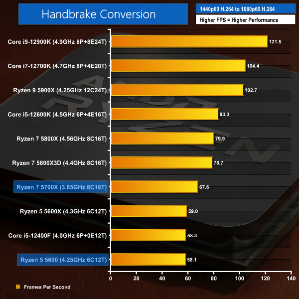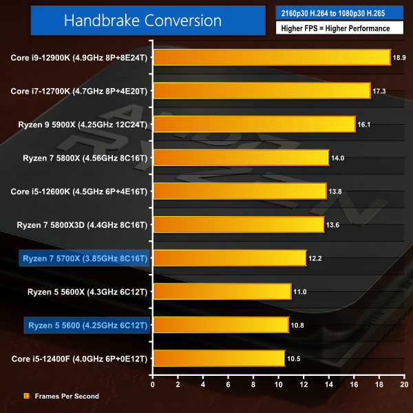 With H265 conversion, Ryzen 5 5600 is slightly quicker than Core i5-12400F. Once again, though, the Ryzen 7 5700X is massively outgunned by the Core i5-12600K – this time to the tune of 13%.