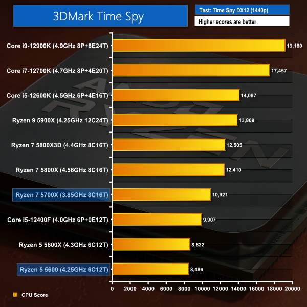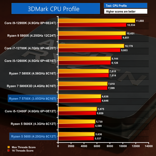 Intel’s price comparable chips are far superior in 3DMark Time Spy. The 5600 non-X does roughly manage to match the 5600X, though. And the trend for 3DMark’s CPU Profile benchmark is more-or-less the same.