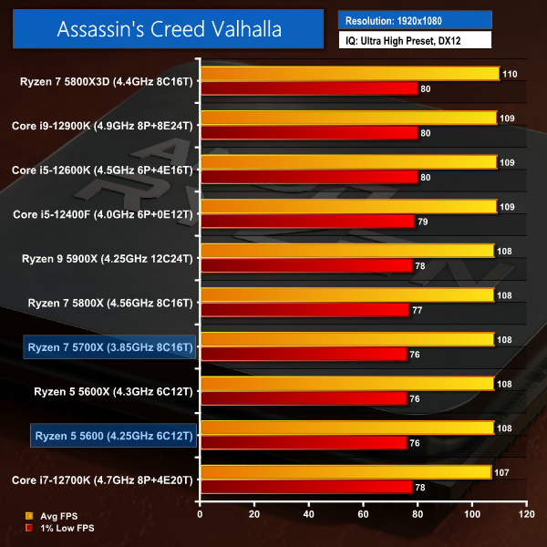 It’s all very tight in Assassin’s Creed Valhalla – a game where we look to be heavily GPU limited with our overclocked 3080. The 5600 and 5700X are only marginally slower than their Intel competitors by virtue of 1% Low FPS numbers.
