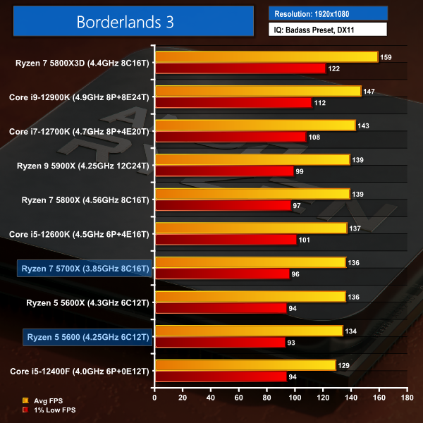 Borderlands 3 has the Ryzen 5 5600 almost matching the 5600X and performing a few FPS above the Core i5-12400F. The Ryzen 7 5700X is a little slower than the higher-clocked 5800X and it cannot quite match the 1% low performance of the 12600K.