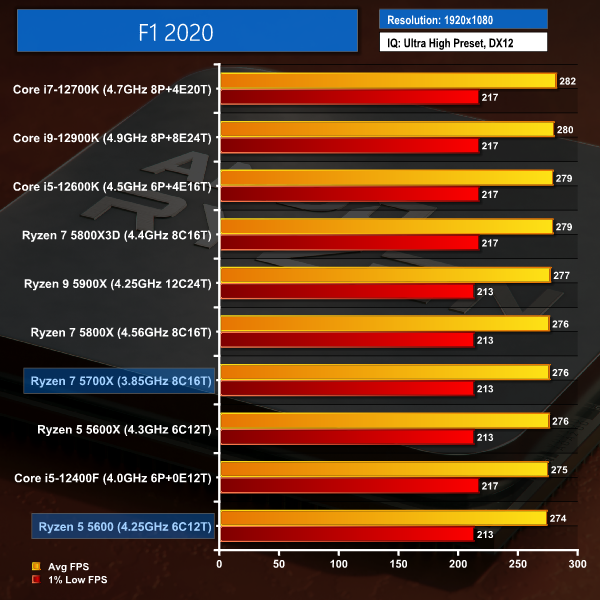 In F1 2020, there is not much difference in performance between the Ryzen 5 processors and Intel’s Core i5-12400F, albeit with the latter having a slightly higher 1% low result. Both Ryzen 7 non-3D chips offer the same performance, and they cannot quite match the Core i5-12600K.
