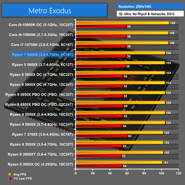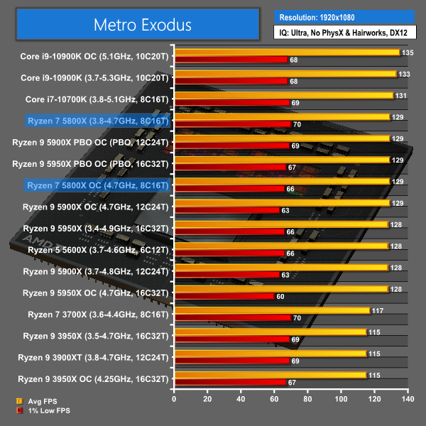 Metro Exodus sees the 5800X matching the other Zen 3 chips, including the cheaper Ryzen 5 5600X. Here, Intel’s Core i7-10700K offers the same performance as the 5800X but the 10-core Comet Lake part is a little faster on average. Compared to Zen 2 competitors including the 12-core 3900XT, AMD’s Ryzen 7 5800X performance uplift is significant and useful given the frame rate range.