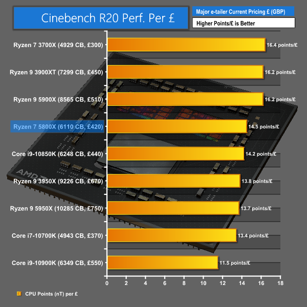 Cinebench-weighted performance value shows a reasonable offering from the Ryzen 7 5800X. Intel’s £20 more expensive and slightly faster Core i9-10850K offers a similar level of value, but the Core i7-10700K does not keep trend.