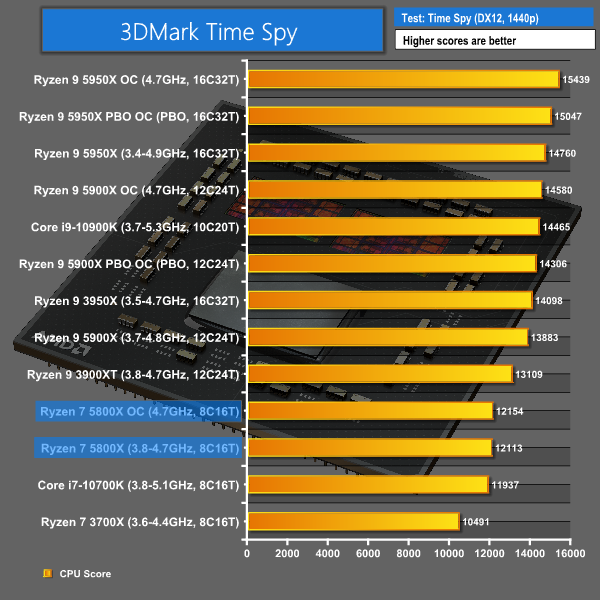 3DMark Time Spy, for what it’s worth, puts the Ryzen 7 5800X ahead of the Core i7-10700K but behind the higher core 3900XT and 10900K.