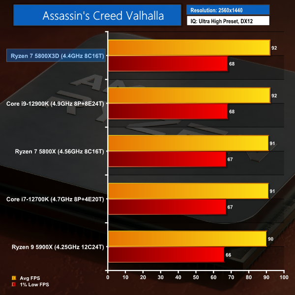 There’s little difference to note between any of the CPUs in Assassin’s Creed Valhalla at 1440p.