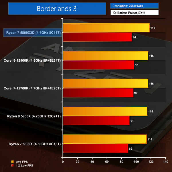 The same can be said for Borderlands 3, though the new Ryzen 7 5800X3D does take a small, technical victory for average FPS coupled with a minor loss for 1% low numbers.