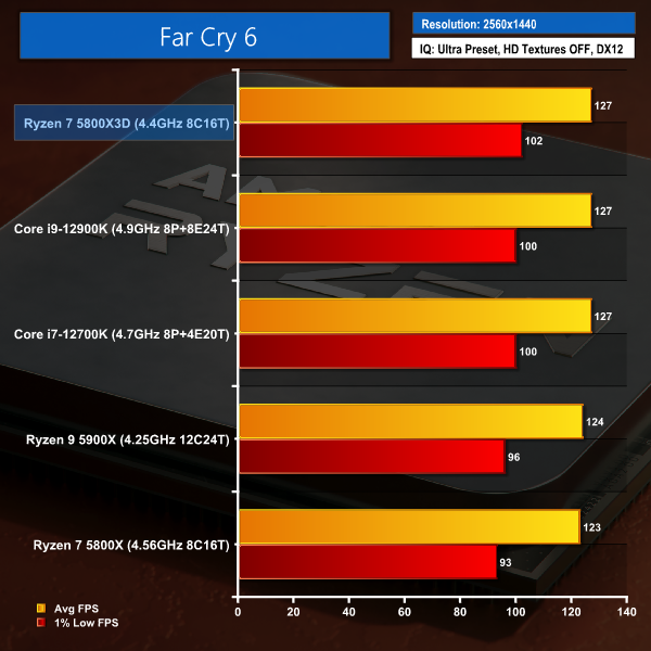 Far Cry 6 is practically a tie between Alder Lake and the new Ryzen processor. AMD clearly deserves credit though for its performance improvements brought about with the new cache setup, as highlighted by the jump in 1% low FPS data.