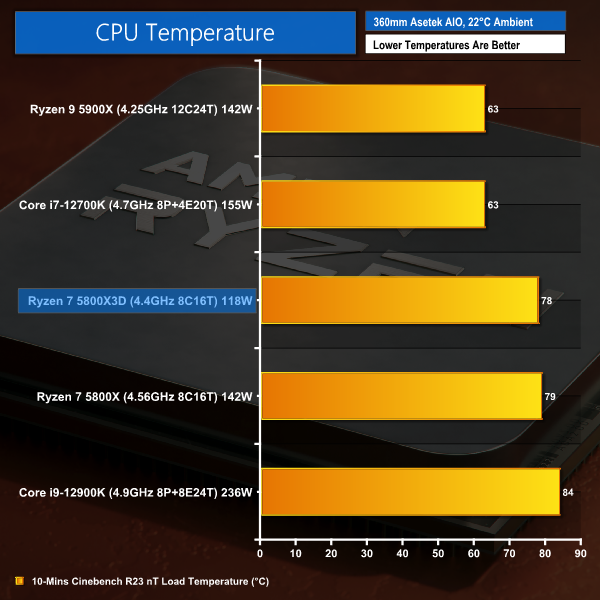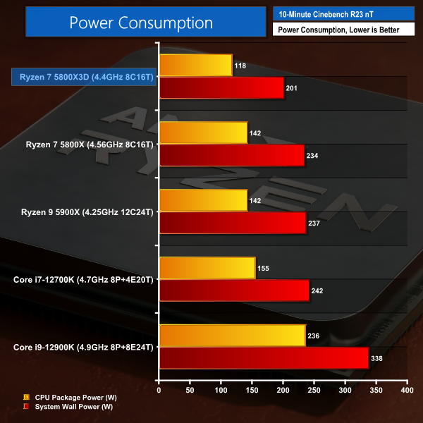 Compared to the Intel chips, AMD’s power usage advantage with the TSMC 7nm process node is clear to see, even with a 64MB L3 Cache die added into the equation. The Ryzen 7 5800X3D sample in our test setup has a reported package power exactly half that of the Core i9-12900K. Needless to say, the Intel 12th Gen part did not deliver double the performance in productivity tasks and was even marginally slower in our gaming tests.