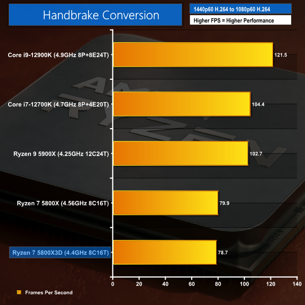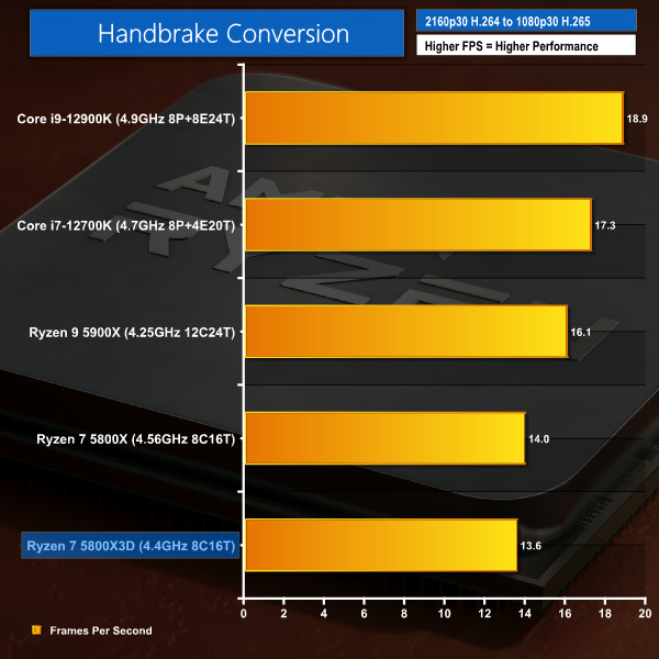 It’s more of the same with H264 and H265 media workloads using Handbrake. The signs thus far are that the Ryzen 7 5800X3D is not a processor for video or rendering workloads.