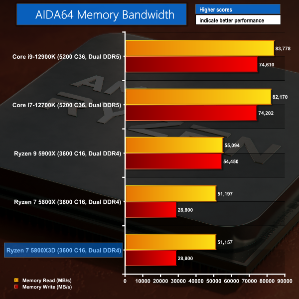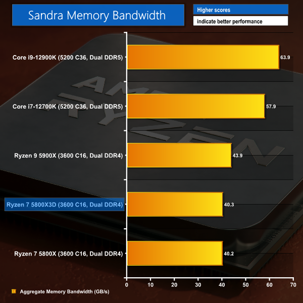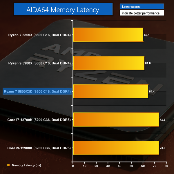 Speaking of memory, we don’t see any real change to DDR4 bandwidth numbers for AMD’s newest processor. Though there was a consistent and repeatable increase in the recorded memory latency for the 5800X3D versus our 5800X and 5900X competitors.