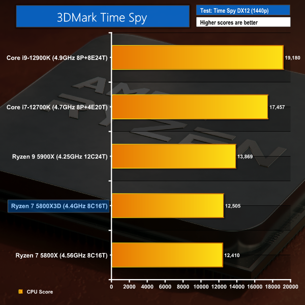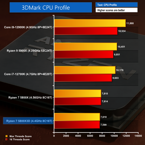 3DMark’s Time Spy test clearly does not value the added L3 cache for its CPU scoring result. And the same can be said for the CPU Profile test which actually sees the Ryzen 7 5800X3D demoted to bottom place by virtue of its reduced clock speeds versus the Ryzen 7 5800X.