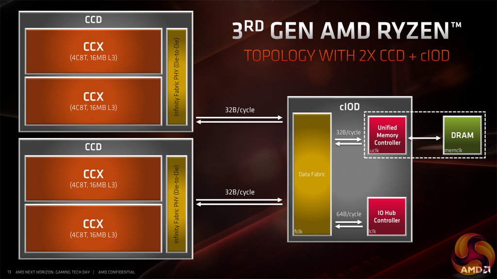 Ryzen 3000 is fabbed on TSMC’s 7nm FinFET process technology, putting AMD in an interesting position where it now has a clear process technology advantage over Intel whose Coffee Lake products use the company’s 14nm++ node. That’s not the whole story though, as the Ryzen 3000 CPUs are made from segregated chiplets that are split as cores and cache in a CCD, which combines two CCXs, and an IO chiplet that handles less-performance-sensitive operations such as memory control and IO management. The 74mm2, 3.9 Billion transistor CCD chiplets – one in the case of eight-cores and below and two for the 12 and 16 core parts – connect to the 125mm2, 2.09 billion transistor IO chiplet via AMD’s Infinity Fabric.