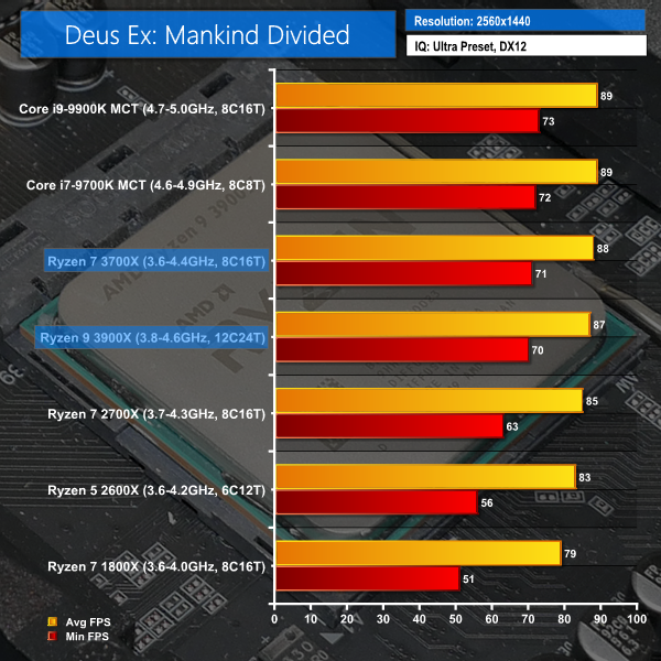 Push up to 1440p in Deus Ex and the performance difference between Coffee Lake and Ryzen 3000 disappears as the GPU struggles to cope with the enhanced demand placed on its silicon.