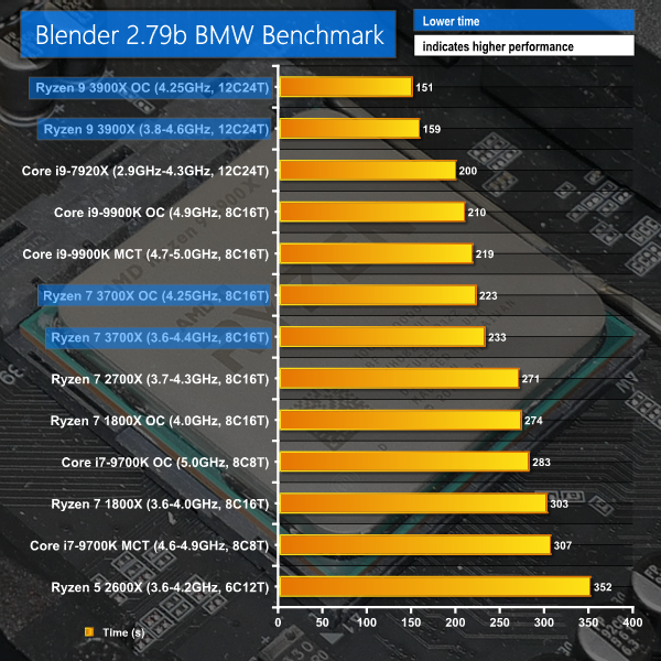 Unsurprisingly at this point, AMD takes another commanding victory in the heavily multi-threaded Blender test. The Ryzen 9 3900X completes the BMW benchmark in 159 seconds – a full 41 seconds faster than the i9-7920X which translates into a 20% performance improvement. AMD’s ability to maintain full clock speed through the Blender test is one of the key factors for its heavy performance increase versus the Intel HEDT part that reverts down to AVX-type operating frequencies close to the 3GHz mark.