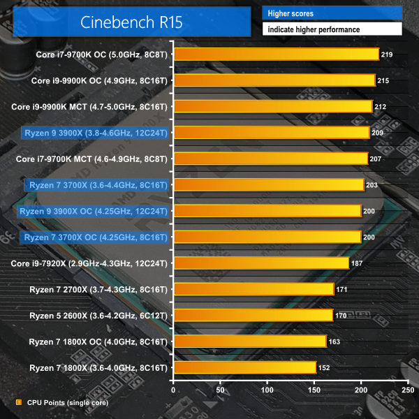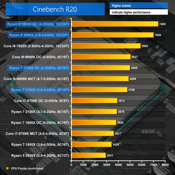Starting with everybody’s favourite – Cinebench R15 – we see AMD cementing their already-strong position obtained through Zen. The twelve-core, 24-thread Ryzen 9 3900X takes top spot in our chart, even before overclocking, handily beating out the significantly more expensive Intel HEDT 12-core chip. Overclocking boosts the 3900X’s score by a little over 100 points but you’d have to be pushing pretty hard to make the doubts of stability and poorer power efficiency worth it over the stock configuration, in my opinion.