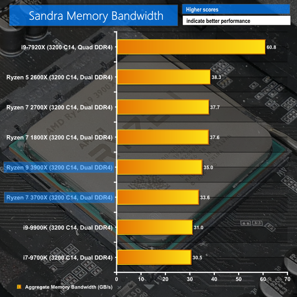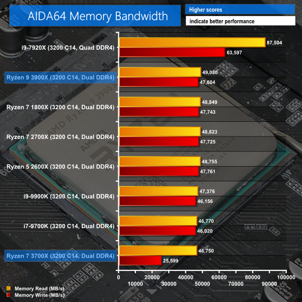 Memory bandwidth is close to where we'd expect it for 3200MHz C14 DDR4 in dual-channel mode. There is a slight performance reduction for Zen 2 versus Zen and Zen+ and this is perhaps attributable to the memory controller's residency in the segregated IO chiplet.