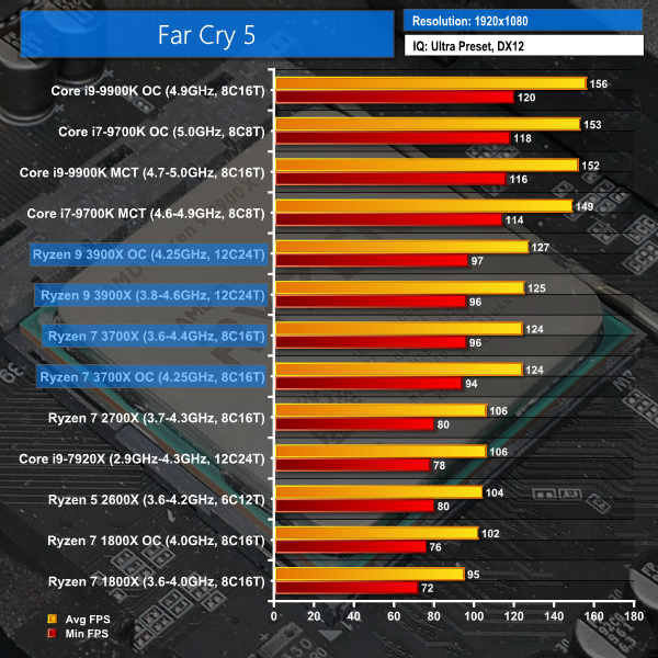 Far Cry’s Dunia engine tends to favour Intel hardware and that’s exactly what we see in our chart. With the Intel chips hovering around 150 FPS on average, AMD’s Ryzen 3000 sits closer to 125 FPS and with lower minimums. Again though, AMD’s Zen 2 gaming improvements have managed to reduce the deficit to the Coffee Lake i7 and i9 from around 30-35% in the cases of Zen and Zen+ to around 15% for Ryzen 3000.